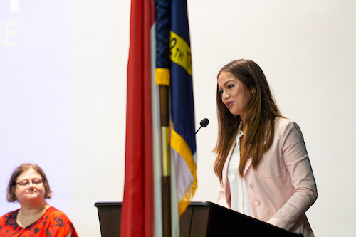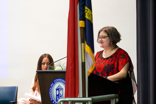 Vanessa Perez Vences, a recent RCC/Randolph Early College High School graduate and QuestBridge Scholar currently attending Duke University, reminds the inductees to thank those who helped them get to where they are.